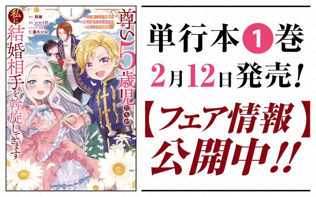 『尊い5歳児たちが私に結婚相手を斡旋してきます~捨てられ令嬢の私に紹介されたのはなんと宰相補佐~』コミックス第1巻 2026年2月12日 発売!!